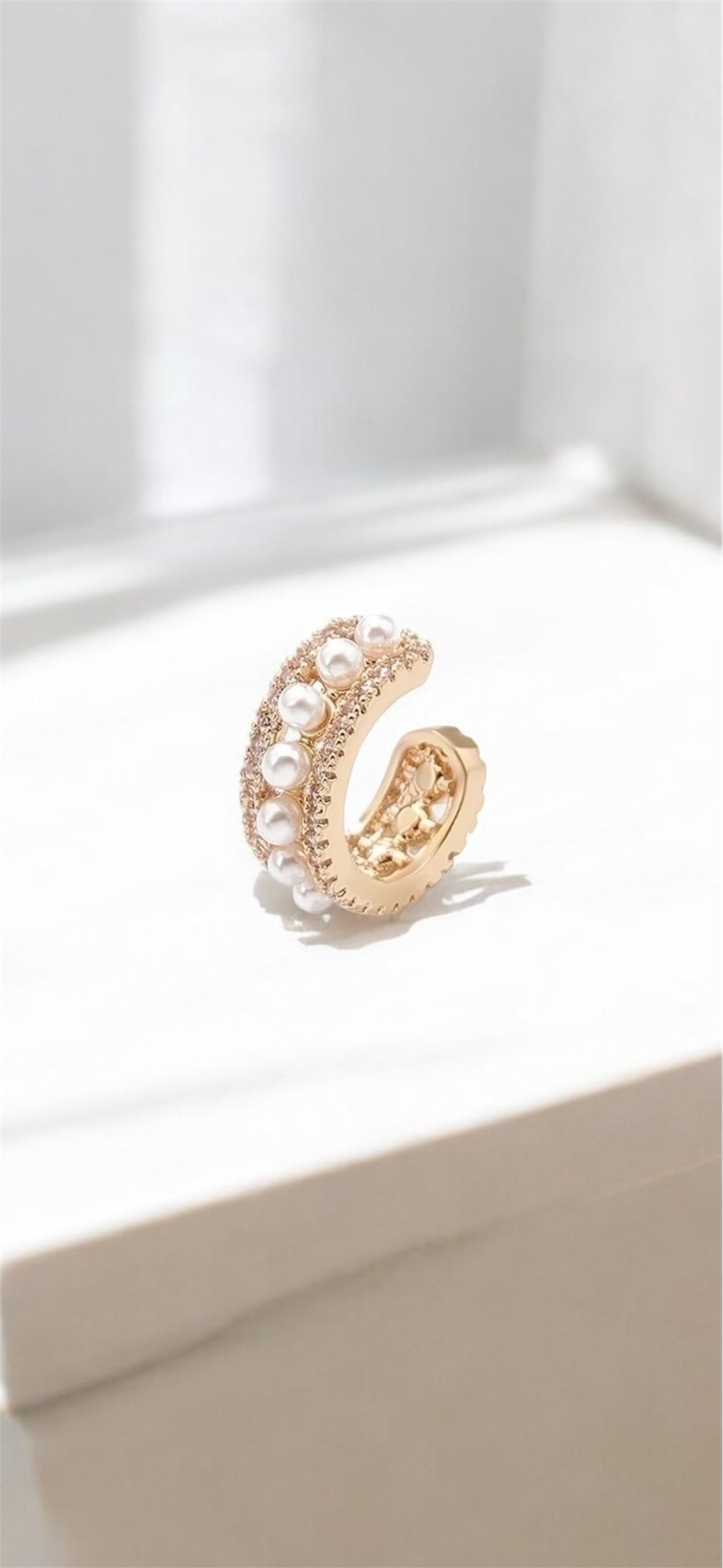 A cuff made to turn heads. This no-piercing-required piece wraps your ear in pearls and pavé shimmer, combining timeless detail with bold presence. A favorite for stacking or making a statement all on its own.