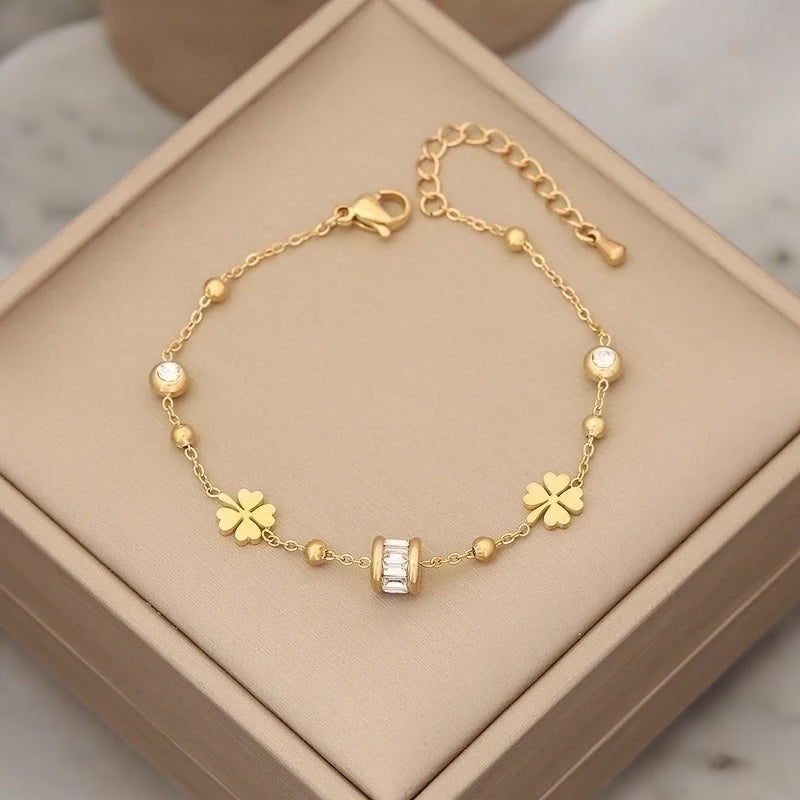 A little motion, a little magic. Flutter features dainty butterflies and golden beads flanked by a sparkling charm — a delicate reminder of soft moments and serendipitous joy.