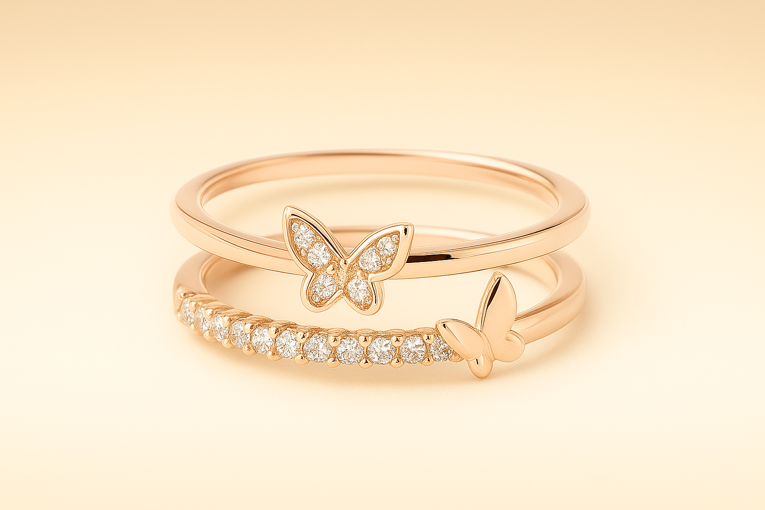 Softly stacked and effortlessly graceful, Flutter Line features twin butterfly accents resting on a delicate dual-band frame, joined by a string of tiny sparkling stones. It’s a subtle nod to flight, freedom, and that quiet kind of pretty.