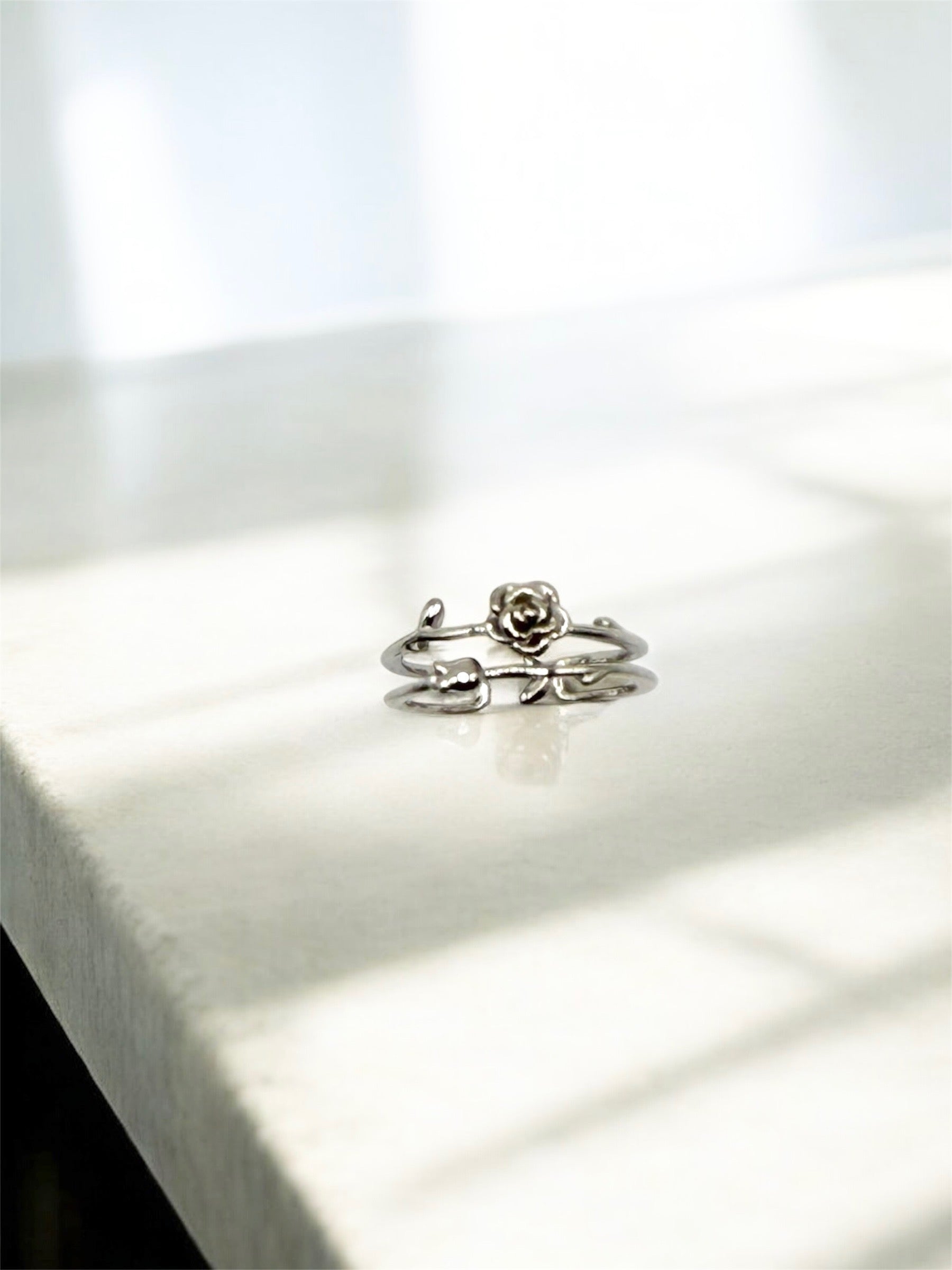 A silver-toned wrap ring inspired by trailing ivy kissed by morning frost. This graceful design features a shimmering vine band that coils gently around the finger, ending in a brilliant faux diamond bloom at the center. Lightweight yet eye-catching, Frosted Ivy is perfect for everyday elegance or adding a touch of ethereal charm to your evening look. Adjustable for a comfortable fit.