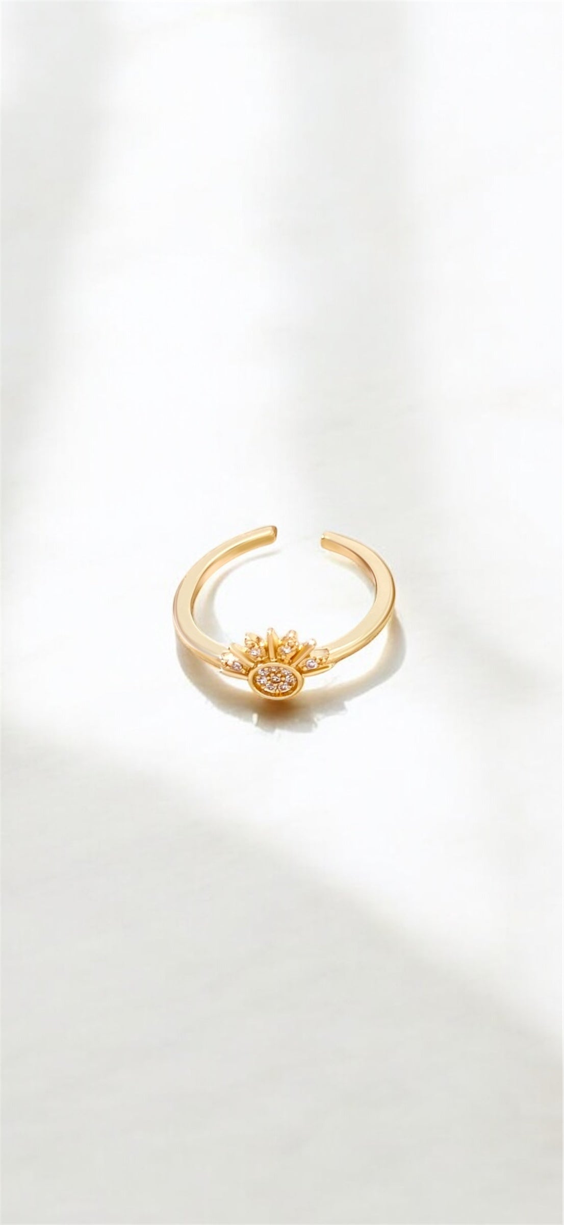 A soft beam of brilliance. Golden Glow features a delicate open band and a sunburst design studded with radiant crystals. It's the kind of piece that warms up your stack or adds light all on its own. Adjustable for the perfect fit and crafted in a polished gold tone, this ring shines with quiet charm and soft presence.