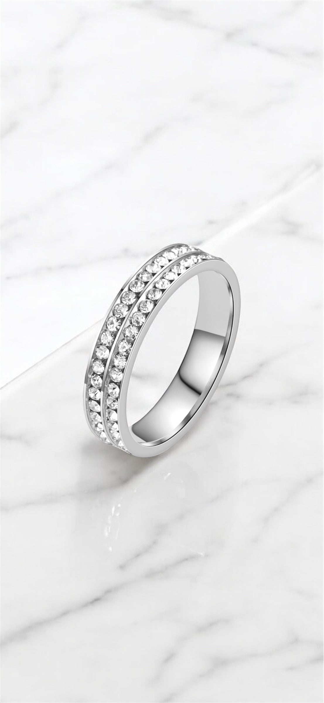 Where minimal meets major. The Golden Standard ring takes the clean, crystal-lined elegance of Golden Rule and amplifies it with a bolder, thicker band. Set with a single row of sparkling stones, it delivers timeless shine with a little more presence. Perfect for stacking—or standing confidently on its own.
