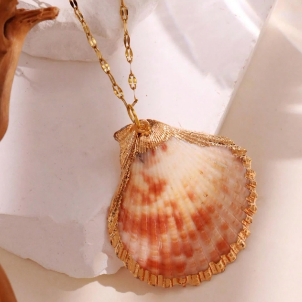 Where earth meets elegance. Golden Tide features a real scallop shell dipped in radiant gold detailing and strung on a bold, textured chain. Every piece is naturally one-of-a-kind, just like the girl who wears it. A statement necklace that brings the beach to brunch, dinner, and everywhere in between.