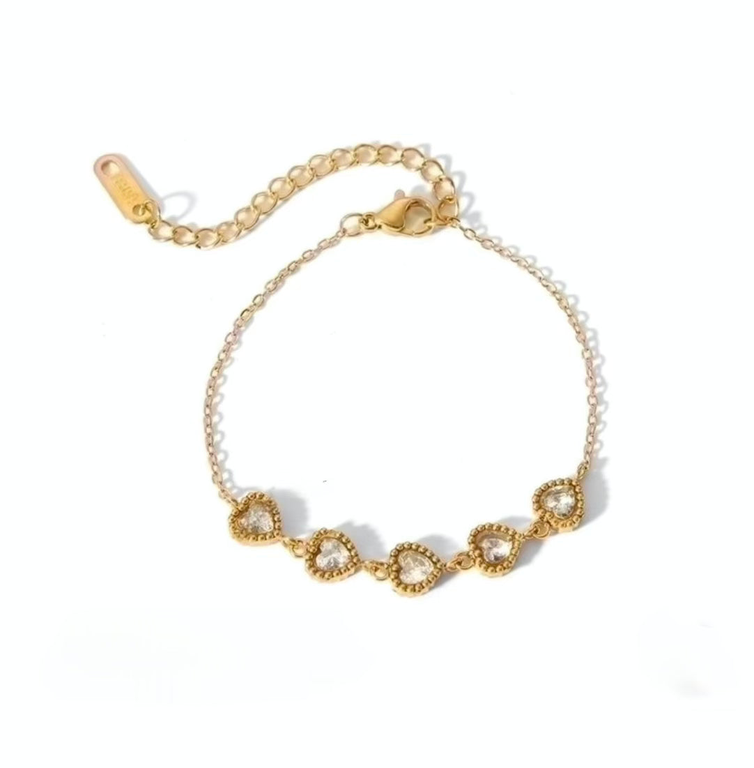 This bracelet features a row of glistening heart-shaped zircon stones, each edged in golden detail and linked by a whisper-thin chain. It’s polished and graceful — the kind of piece you can wear to dinner or dress up your daily look.