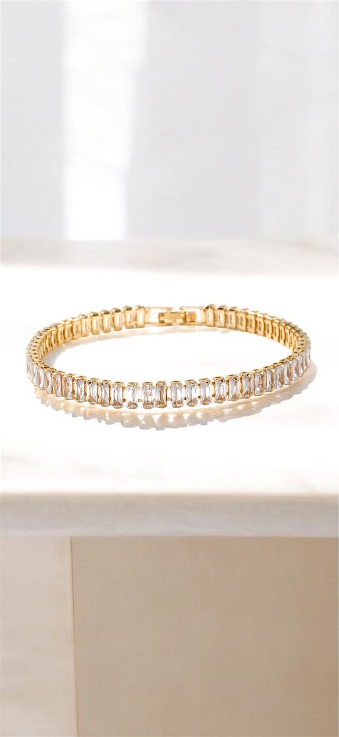 Sharp. Sleek. Unmissable. High Beam wraps your wrist in a flawless stretch of baguette-cut brilliance, set in gold for that rich, mirror-like shine. It’s the bracelet that catches light—and attention—at every turn.