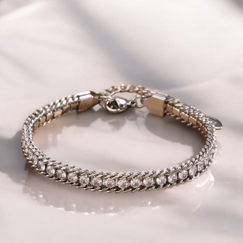 A bracelet that plays it cool—Ice Link brings polished edge with a row of brilliant CZ stones set in a chunky silver chain. Whether you're dressing up your denim or stacking it with dainty layers, this piece adds just the right amount of chill.
