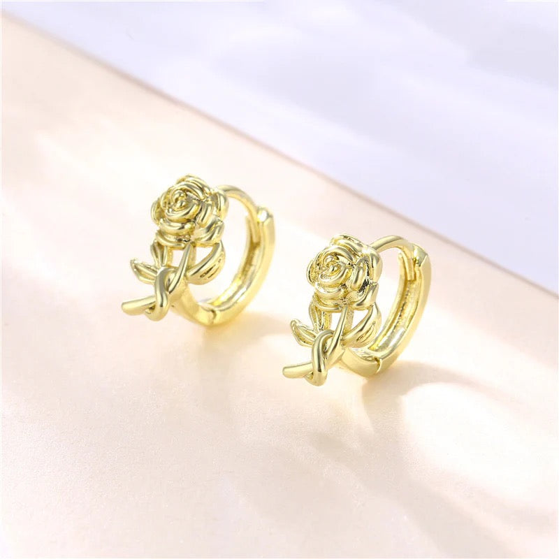 A golden love letter to your softer side. These rose-shaped huggies wrap around the ear with sculpted petals and a trailing stem — delicate, radiant, and unmistakably feminine. Whether you're dressing up or keeping it casual, this pair adds a poetic touch to every look.