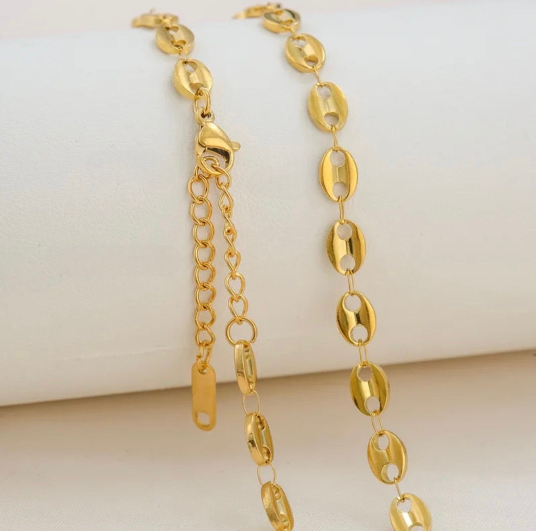 Link Up is your new go-to gold chain — bold oval links, buttery shine, and just enough weight to feel luxe without trying too hard. Wear it solo for a sleek statement or stack it with your faves for an elevated layered look. It’s confident, classic, and totally effortless.
