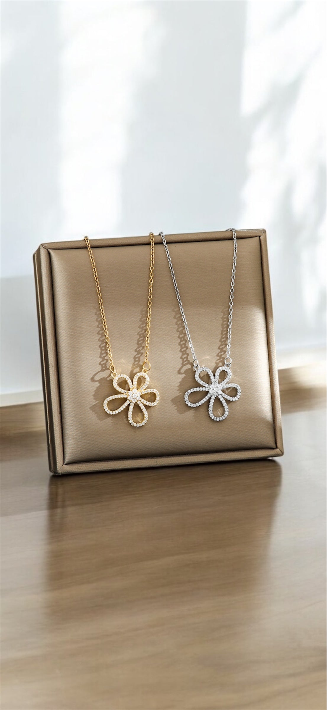 Delicate but far from simple. Loop de Luxe is a dazzling pendant that reimagines a flower through looping curves and pavé sparkle. Available in gold or silver, it’s the perfect touch of shine for soft days or statement layers.