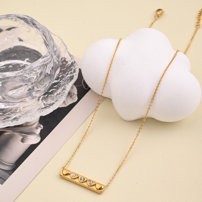 Love Coded features a sleek gold bar pendant detailed with two heart accents and a row of shimmering crystals. Minimal yet meaningful, it’s the kind of piece that says a lot without saying too much. Wear it solo for a soft statement or layer it with your favorites to complete the look.