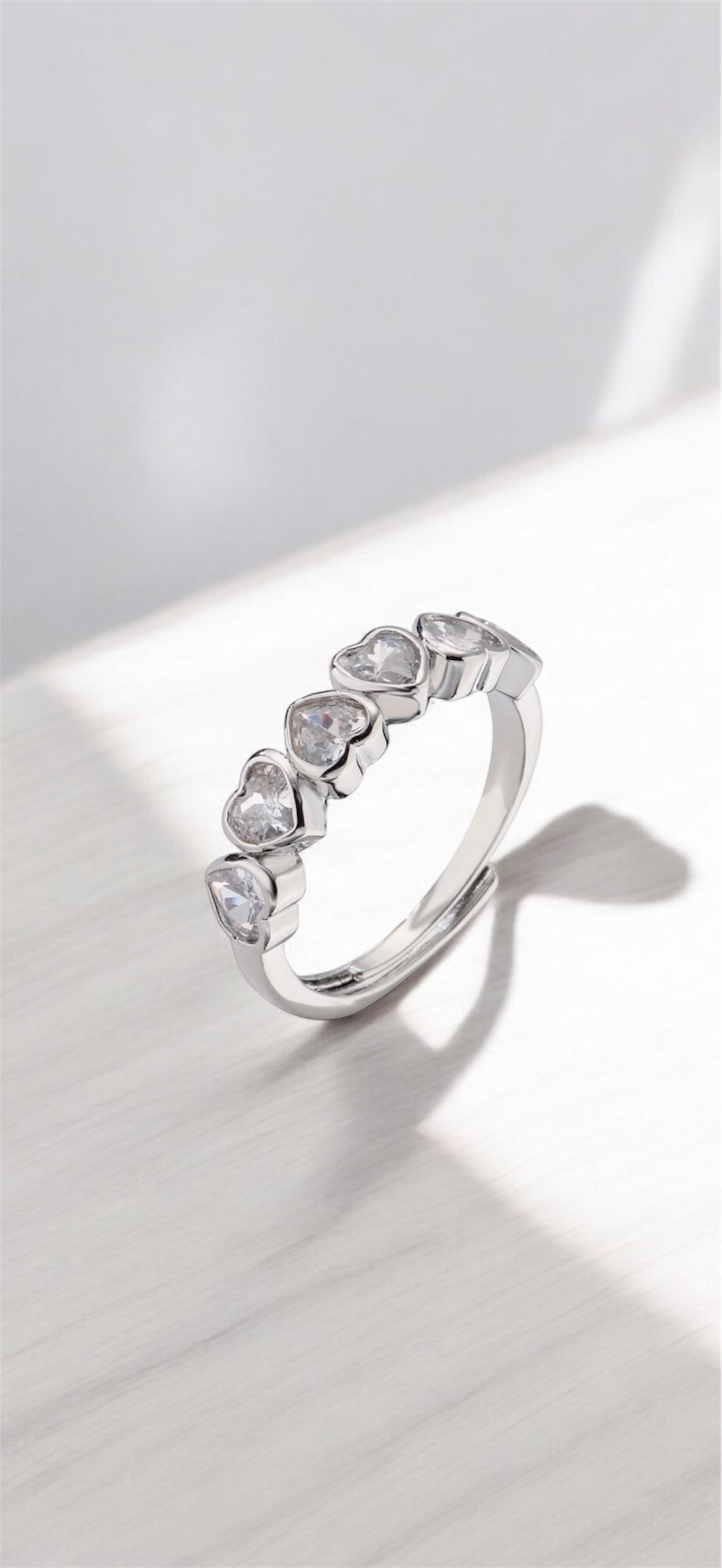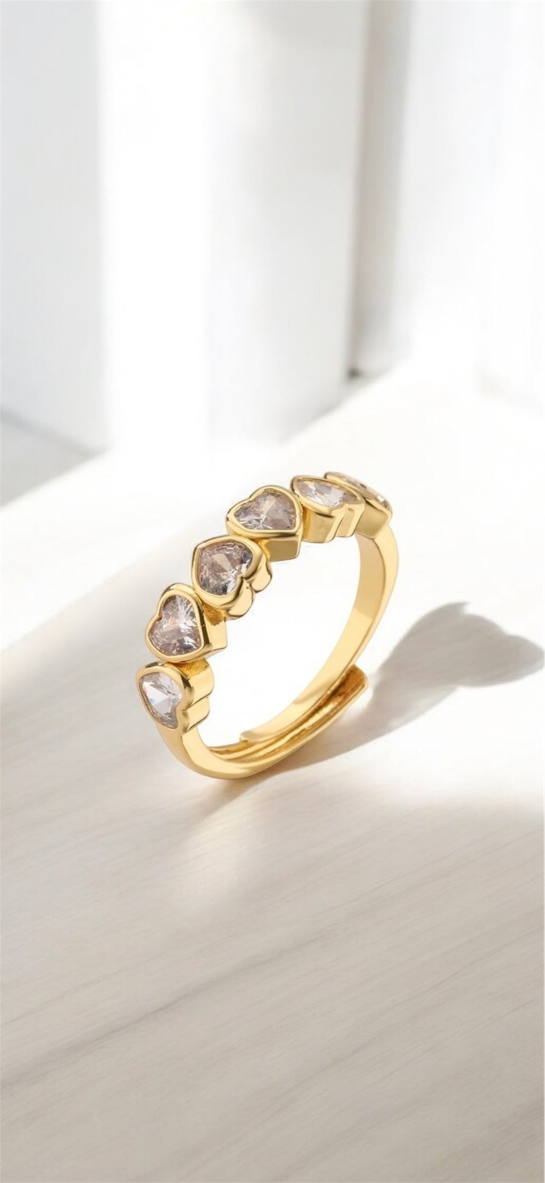 A trail of crystal-cut hearts, each one catching the light like a love letter sealed in sparkle. Lover’s Row is where dainty charm meets everyday romance—gold-plated and endlessly dreamy. Whether you stack it or let it shine solo, this ring wraps your finger in quiet affection and glimmering grace.