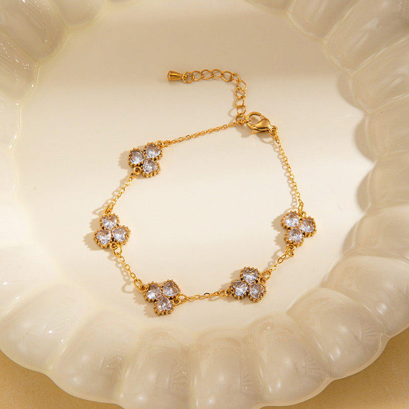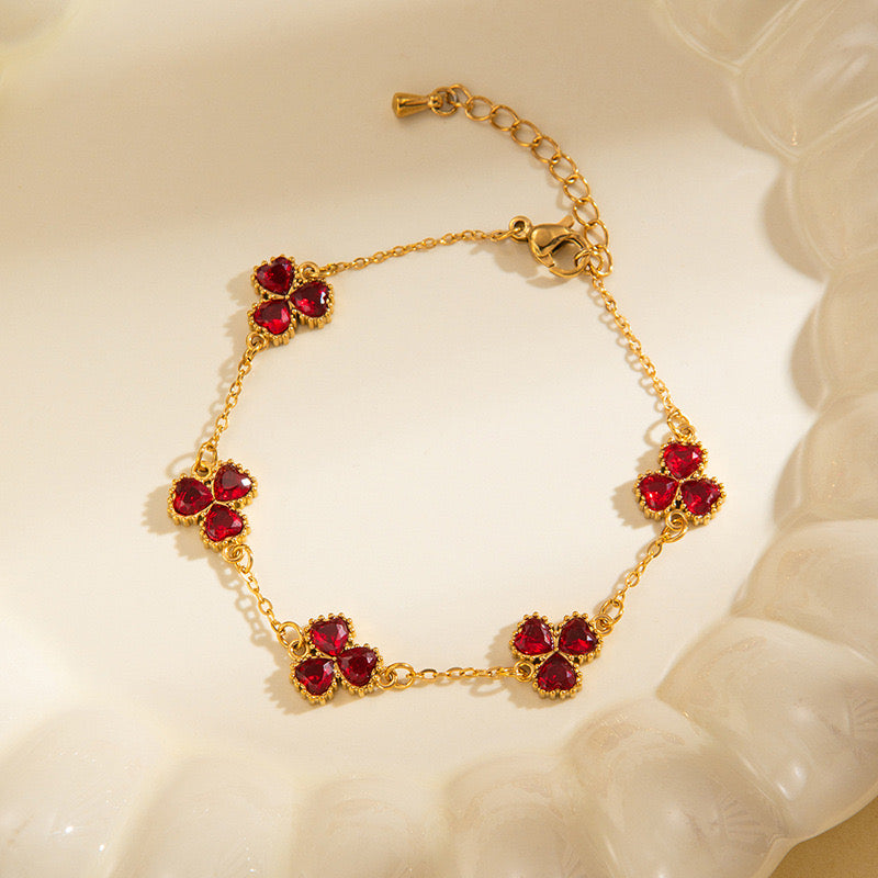 Delicate charm, divine sparkle. Lucky Links features a string of dainty clover-shaped clusters made from heart-cut stones—each one meant to bring a little beauty (and a little luck) to your wrist. Choose clear for classic shine, emerald for good fortune, or ruby for love that lingers.