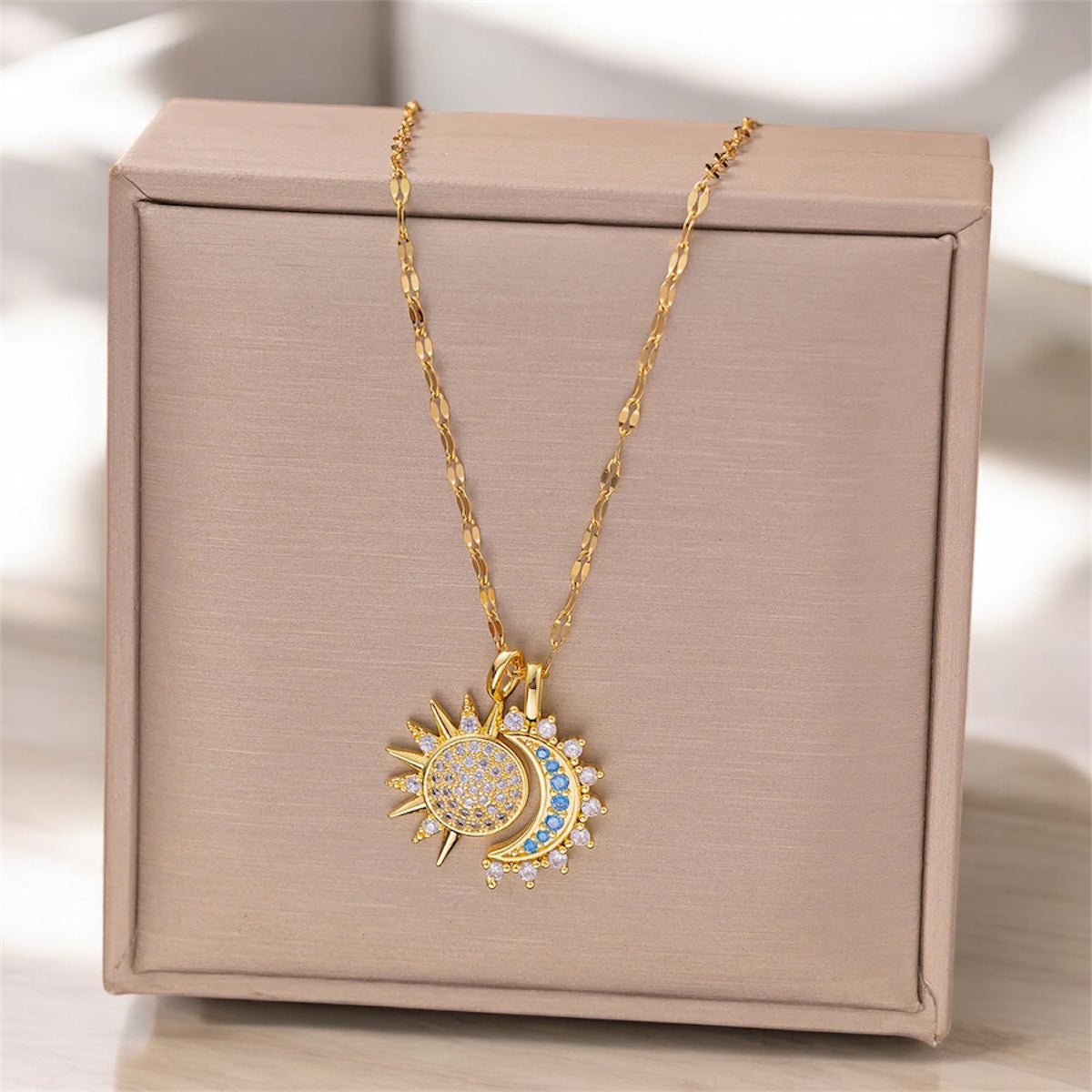 Lunar Light brings balance and brilliance with a dazzling sun and moon pendant duo. Set in gold and detailed with radiant CZ stones and soft blue accents, this necklace is your daily reminder to honor both light and shadow.