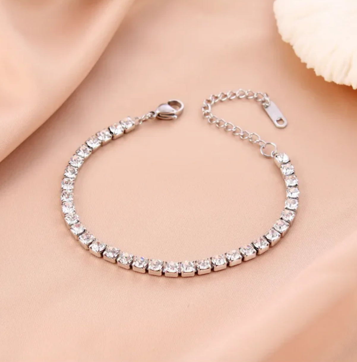 A refined take on a classic favorite. Luxe Orbit is a 4mm tennis bracelet that catches the light with every move. Each stone is cradled in polished gold or silver-tone settings, radiating elegance from every angle. Whether you're stacking or solo-styling, this piece elevates the everyday.