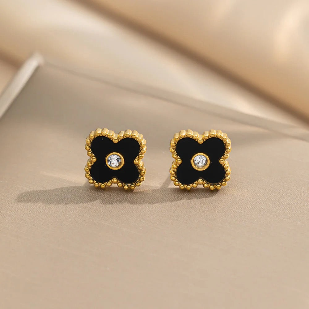 Classic but not quiet. Midnight Bloom features a clover-like silhouette in deep black enamel, framed in textured gold with a single center gem that catches the light just right. These studs add a polished edge to any look—day or night.