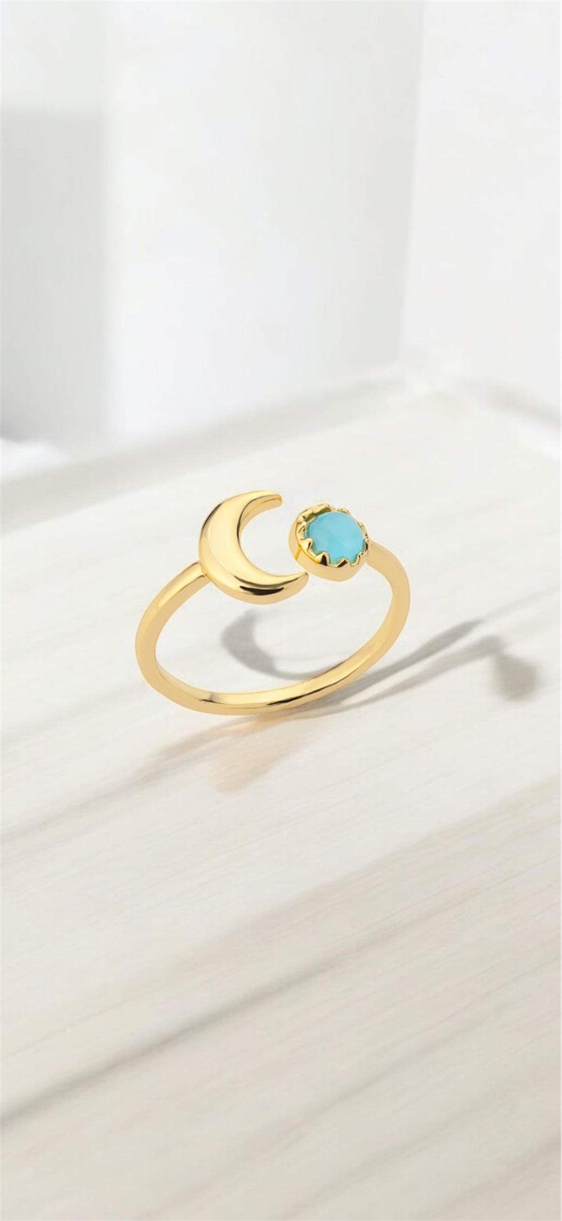 A dreamy pairing of moonlight and sky, Moonrise features a polished crescent and a soft turquoise stone that feels like twilight wrapped around your finger. This open band ring glows with calm, feminine energy—an everyday piece for your inner daydreamer.