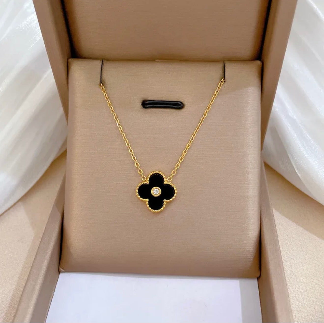 A moody twist on a classic silhouette, Night Petal features a glossy black clover pendant framed in gold, anchored by a single sparkling stone. Bold yet minimal, it’s a quiet statement piece for your most elegant hours.