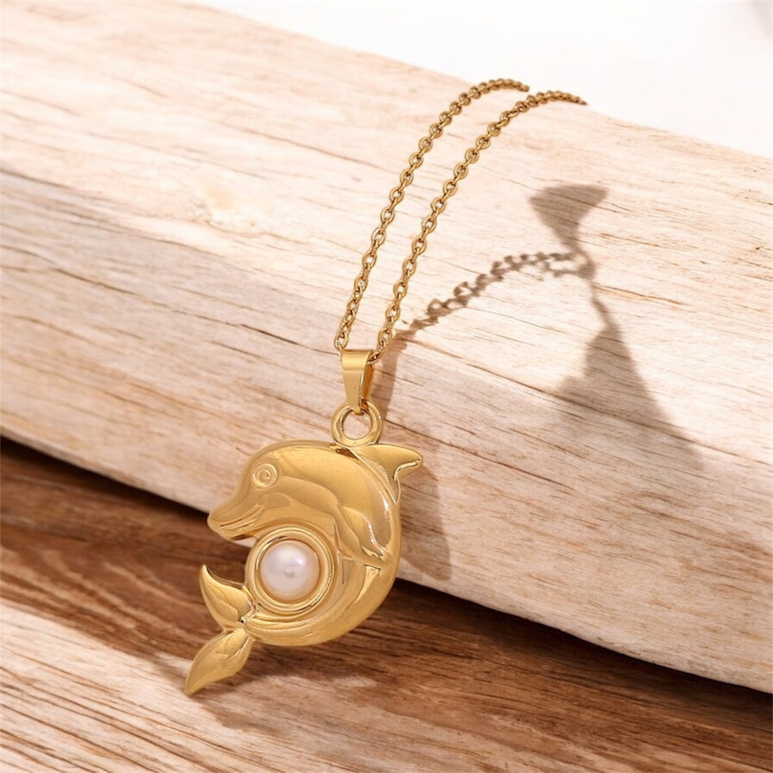 Playful yet elegant, Ocean Whirl brings a golden dolphin into the spotlight, dancing around a luminous pearl center. With fluid curves and a warm shine, this piece radiates charm and movement—perfect for lovers of the sea and statement simplicity. Crafted in stainless steel with a chain that rests comfortably at the collarbone.