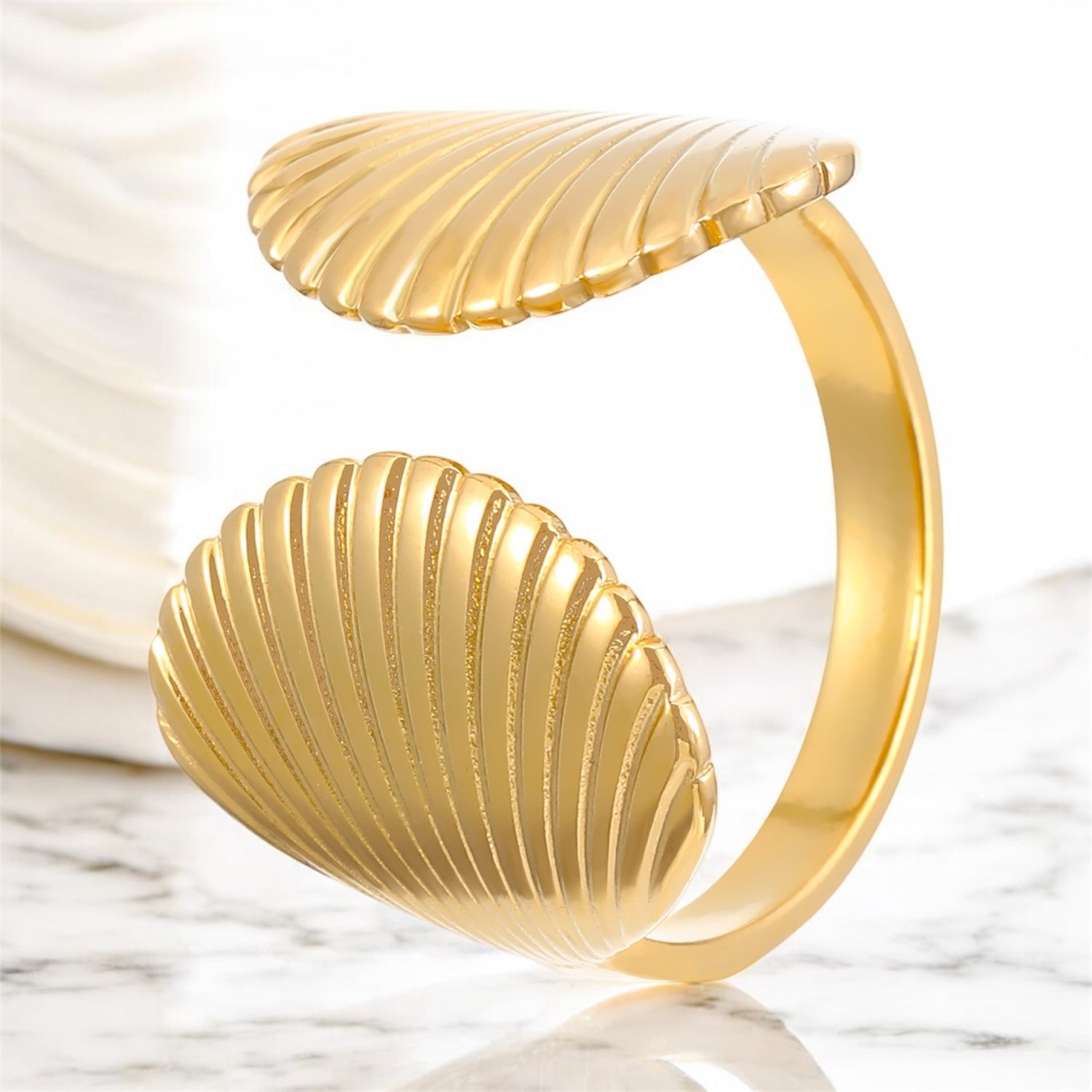 Polished, poised, and straight from the sea. The Open Shell ring wraps your finger in two golden scallop shells, creating an open band that’s bold yet refined. Lightweight and adjustable, this ring makes a statement on its own or stacked with your other beachside favorites.