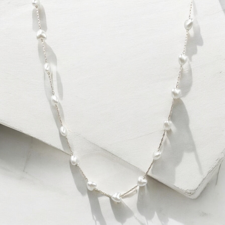 Soft words, sweet shimmer. Pearlspoken features a delicate chain dotted with heart-shaped pearls, strung together like a whisper of love. Lightweight and luminous, it’s perfect for layering or wearing solo when you want your jewelry to speak softly and shine bright.