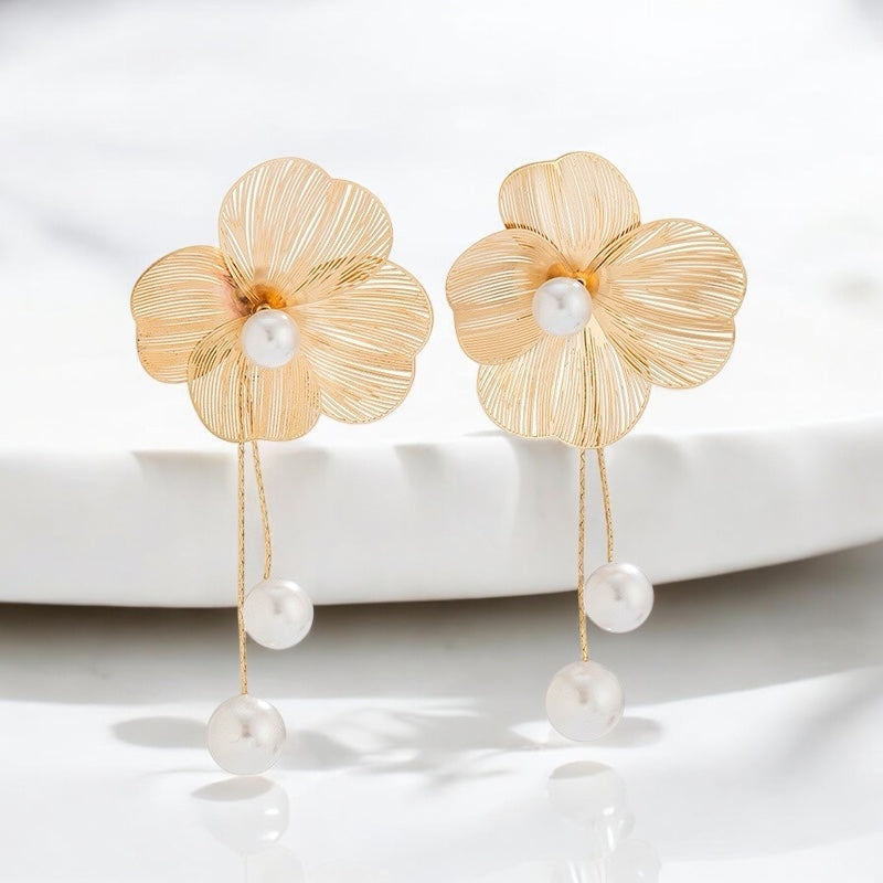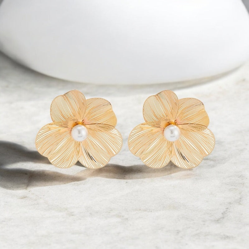 A soft statement with sculpted shine—Petal Poise earrings bloom with brushed gold petals and a glowing pearl center. Choose the simple stud for a sweet everyday elegance or go bold with the cascading drop style for a full floral flourish. Either way, they're the kind of bloom that won't wilt with time.