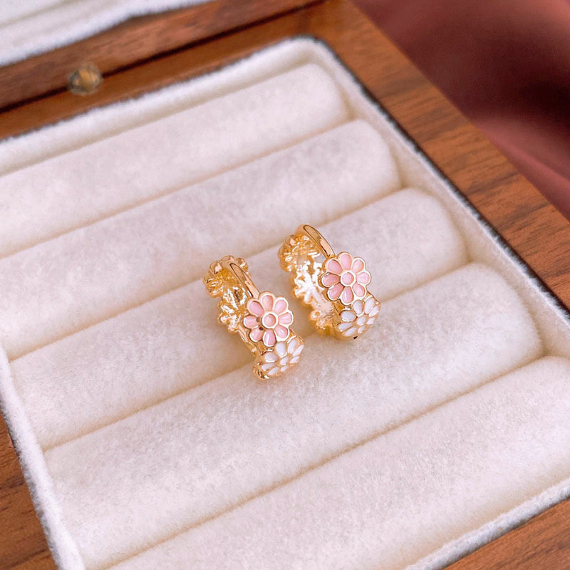 Dainty petals, soft colors, and the kind of charm that never goes out of season—Pressed for Pretty is a fresh take on floral hoops. These gold huggies feature blush and white enamel daisies, clustered like a little bouquet you can wear every day.