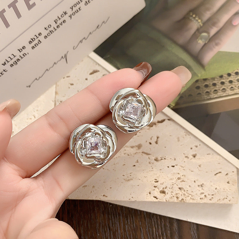 Sculpted like a rose in bloom, these stud earrings are soft, structured, and impossible to ignore. A cushion-cut gem glistens at the center, set against fluid petals in gold or silver. Feminine, yet fierce.