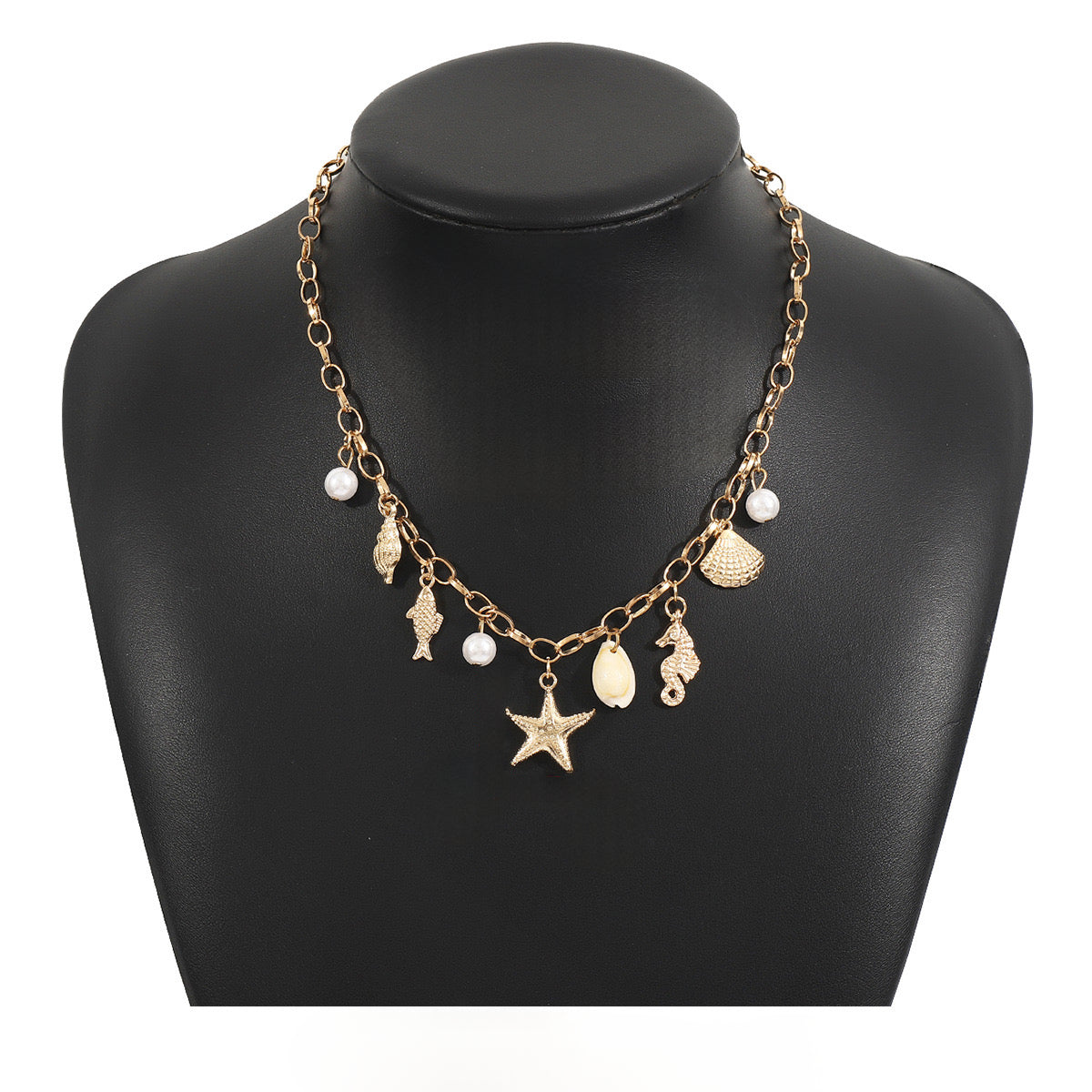 A necklace that tells a tale of the sea. Sea Story features a bold gold chain adorned with ocean-inspired charms—tiny fish, shells, pearls, a starfish, and more—all dancing with every move. It’s playful, luxe, and made for the girl who always has a little beach in her soul.