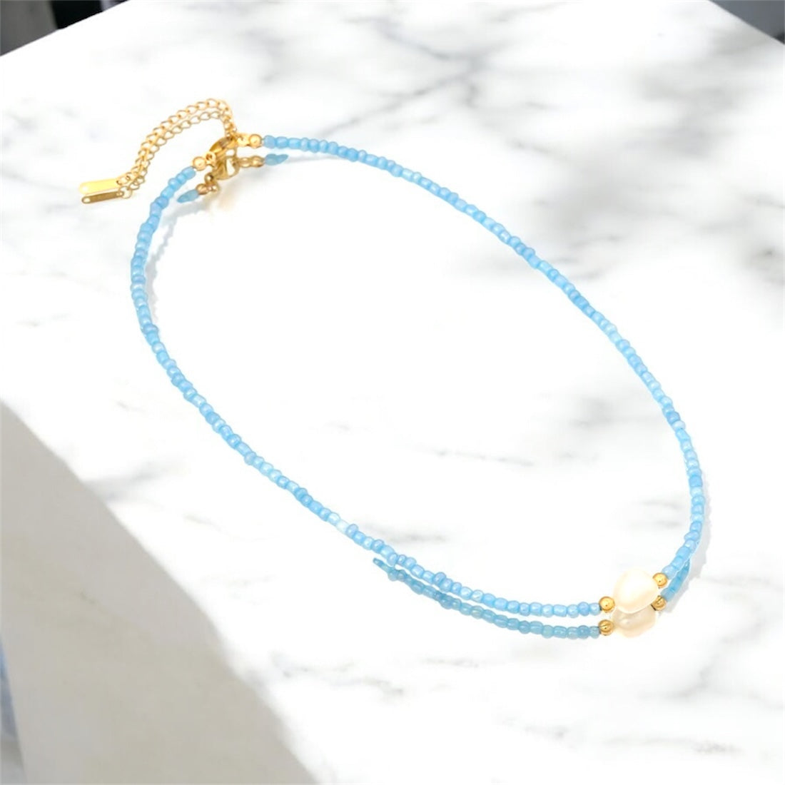 A delicate dance of ocean blue seed beads wraps around your neckline, anchored by a freshwater pearl center and glimmering gold accents. Sea Whispers feels like summer breeze and sunlit waves—light, effortless, and endlessly wearable.