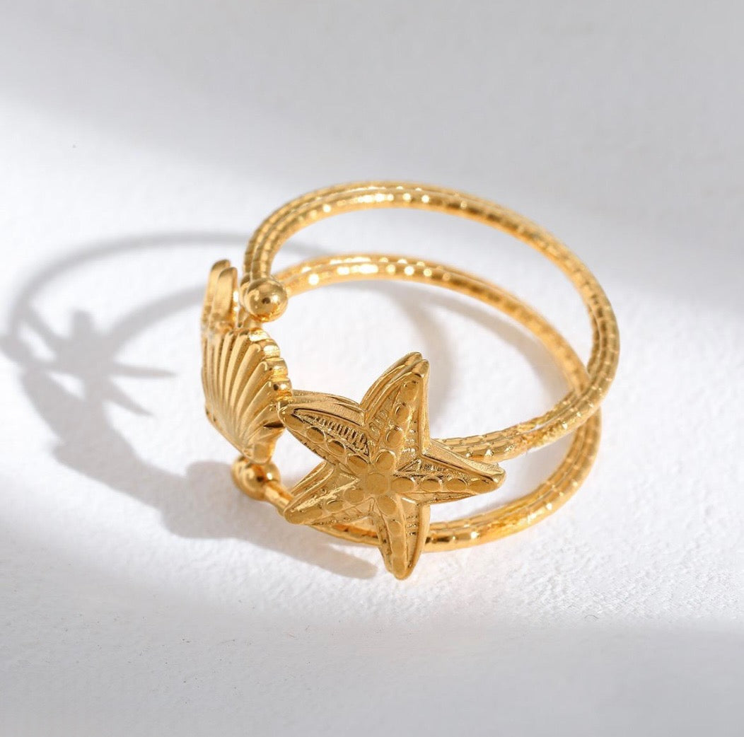 A star of the sea, wrapped in gold. Seastar Band is a double-layered ring featuring a textured starfish and shell duo on beaded gold-tone bands. Light, adjustable, and full of coastal charm, it’s the kind of piece that turns every outfit into a beachy moment—no ocean required.