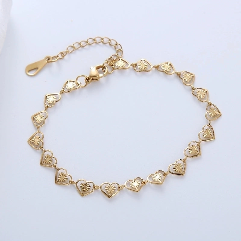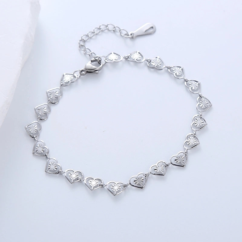 A bracelet that catches the light and keeps it. Starlet Link features a delicate chain of engraved hearts, each one etched with a subtle starburst design that adds shimmer and charm to every angle. Available in your choice of radiant gold or sleek silver, this piece is perfect on its own or layered with your favorite stack. Feminine, flirty, and full of glow—just like you.