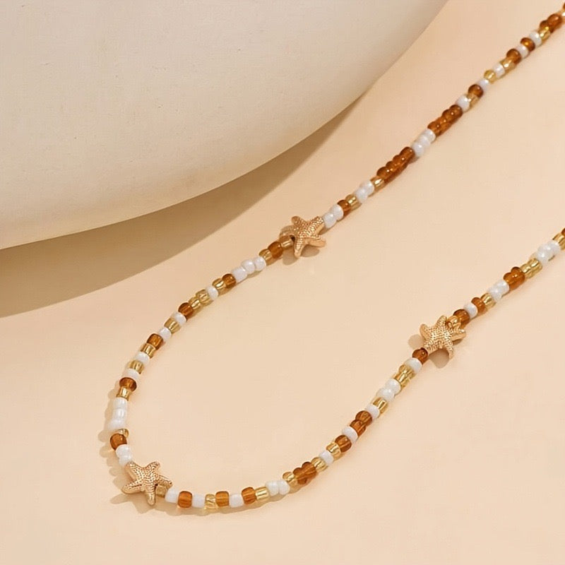 Your beach-day favorite just leveled up. Starshore is a dainty beaded necklace strung with warm amber, pearl-white, and gold-toned beads—finished with tiny starfish charms for that sunkissed, coastal glow. Lightweight, easy to layer, and perfect for every oceanside outfit.