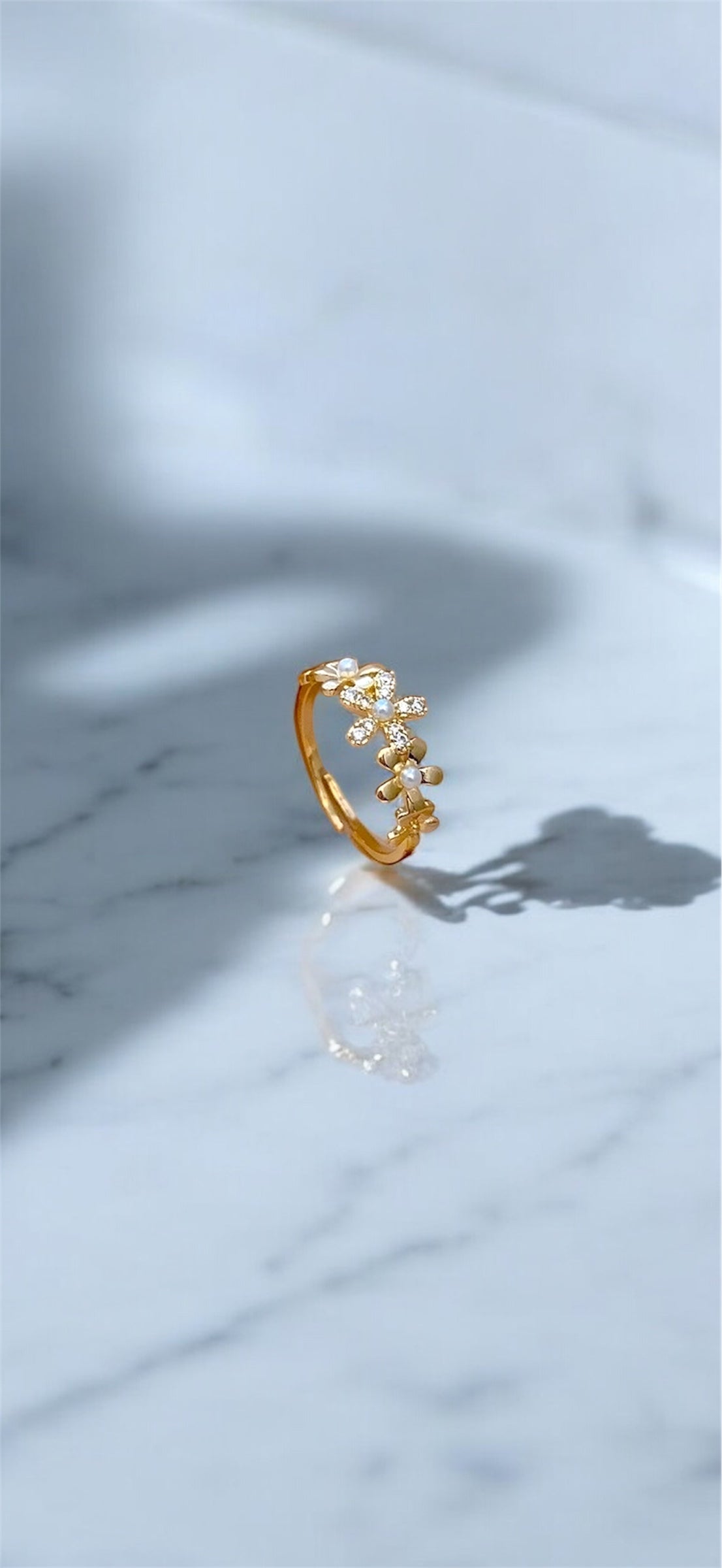 Polished, pretty, and effortlessly charming—Sunday Best is the kind of ring that dresses up your hand without saying a word. Dotted with delicate pearl-centered florals and framed in soft gold, this open band feels like a gentle nod to lace gloves and fresh bouquets. Whether you’re heading to brunch, a garden party, or just feeling extra feminine, Sunday Best is your go-to for a quiet little glow-up.