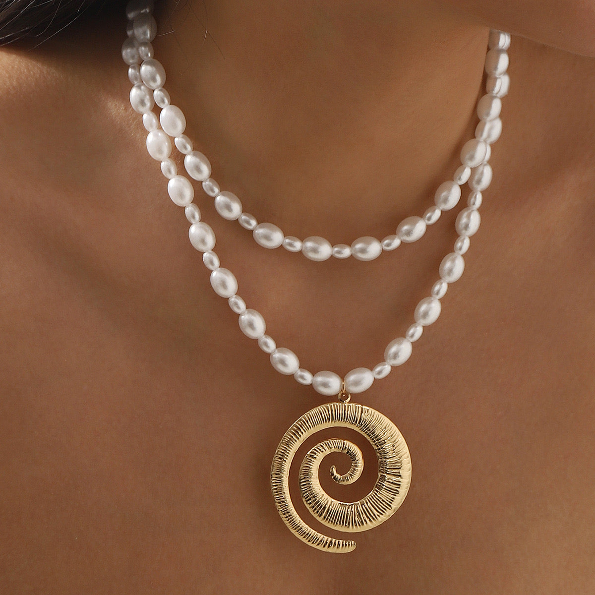 A double strand of pearls meets a bold golden spiral in Tide Loop—a necklace that captures the rhythm of the sea and the sophistication of a statement. With its unique swirl pendant and classic pearls, this piece feels both grounded and ethereal. Style it with an open neckline or layered textures for a truly luxe moment.