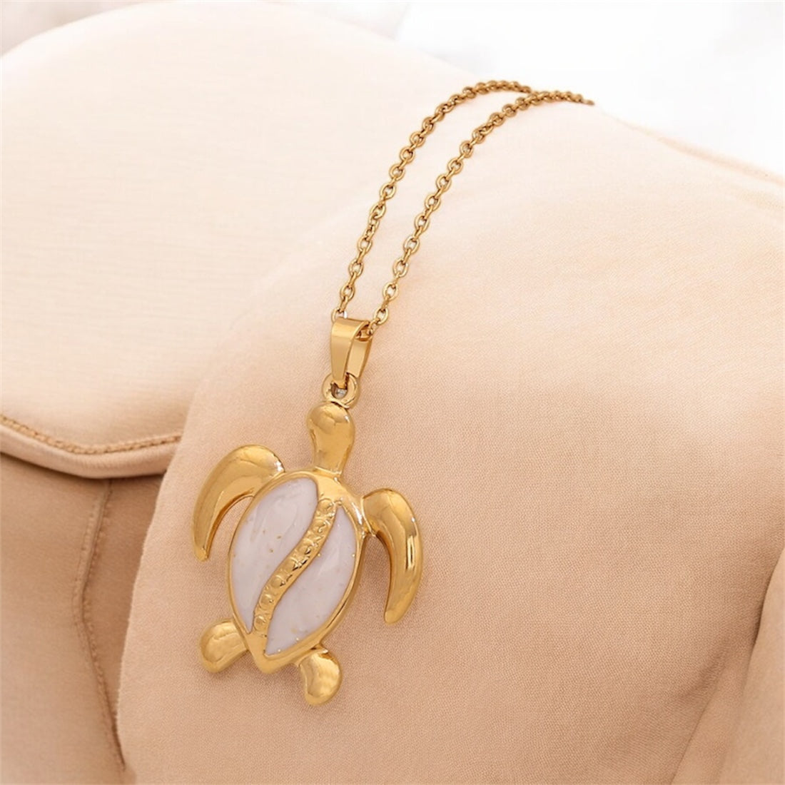 A gentle traveler of the sea, this gold turtle pendant necklace is a symbol of peace, resilience, and slow beauty. With a glossy white inlay and graceful curves, Tidewalker brings a serene ocean energy to your everyday look. Made with stainless steel for lasting shine, it's a soft statement piece that feels both playful and grounded.